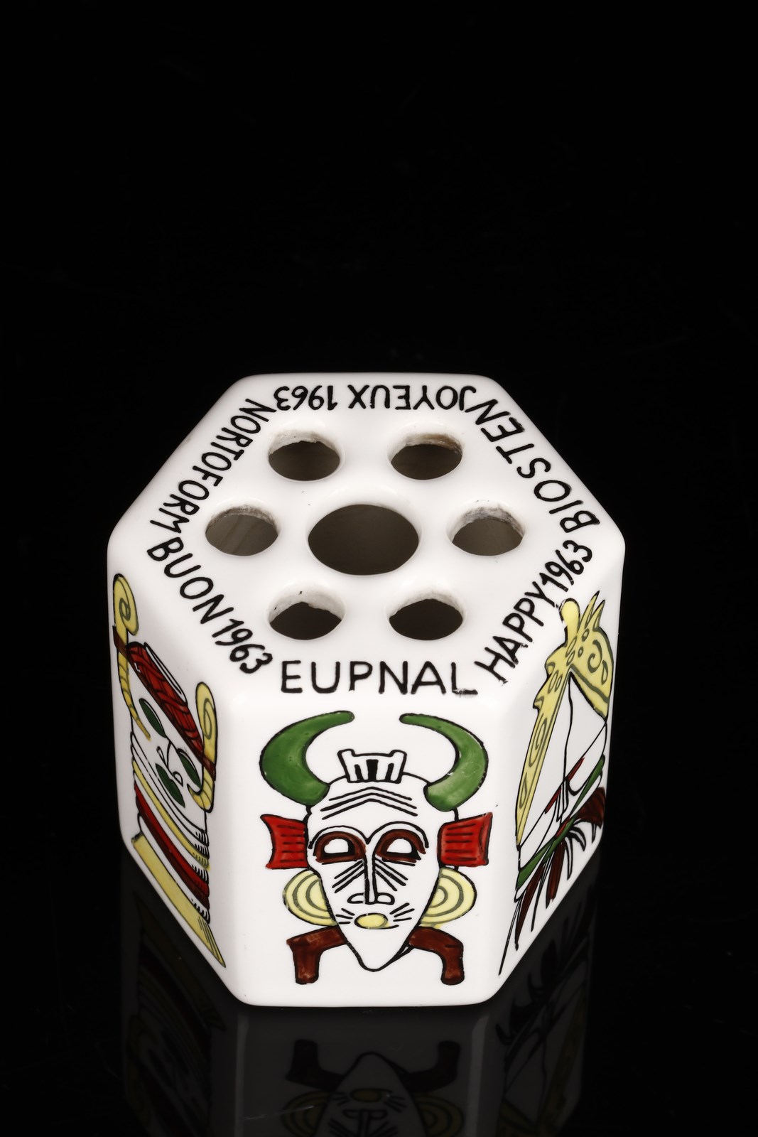 . . Cm 8,00 x 8,00 x 7,20. Portapenne e matite in forma esagonale con sette fori, sei decorazioni a colori di sei tipologie di maschere africane e con auguri di buon anno 1963, scritti in sei lingue.