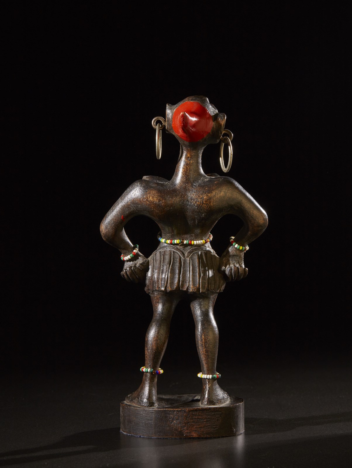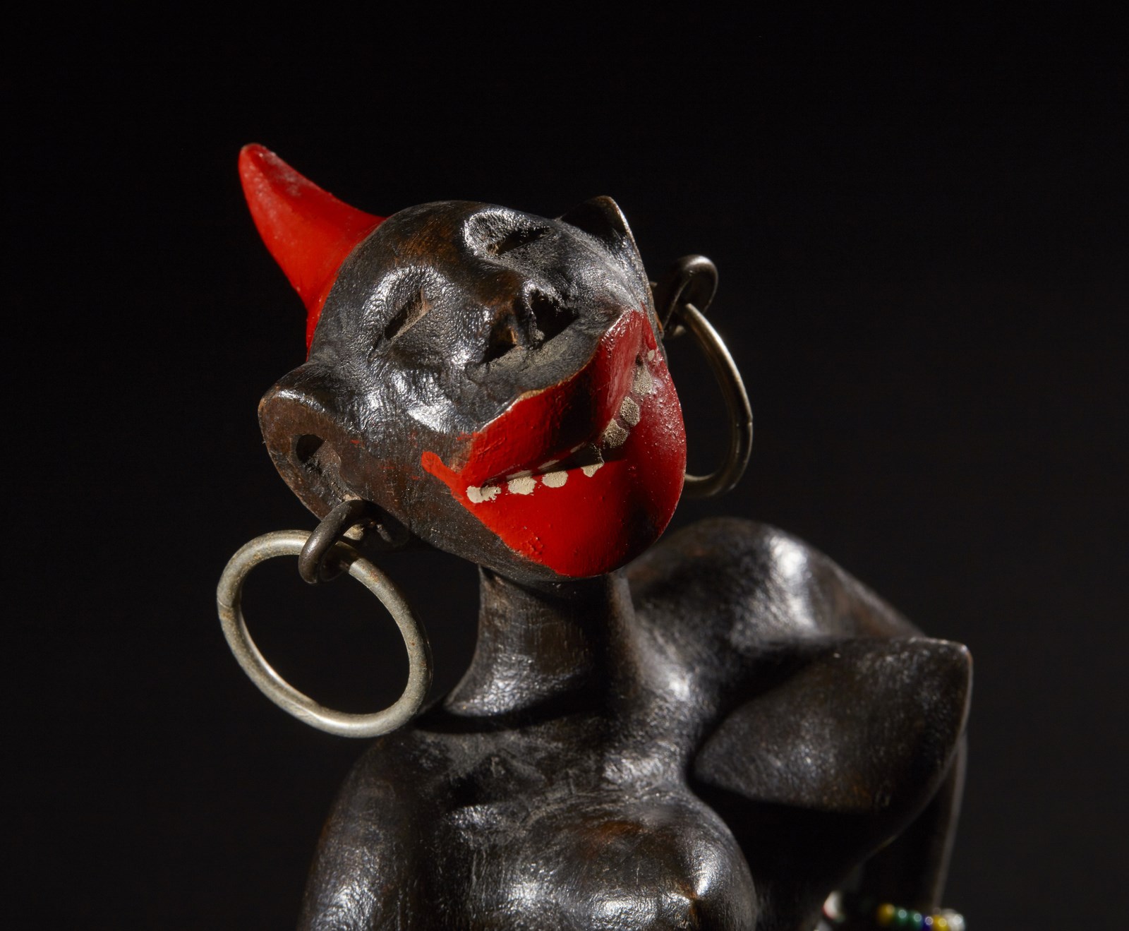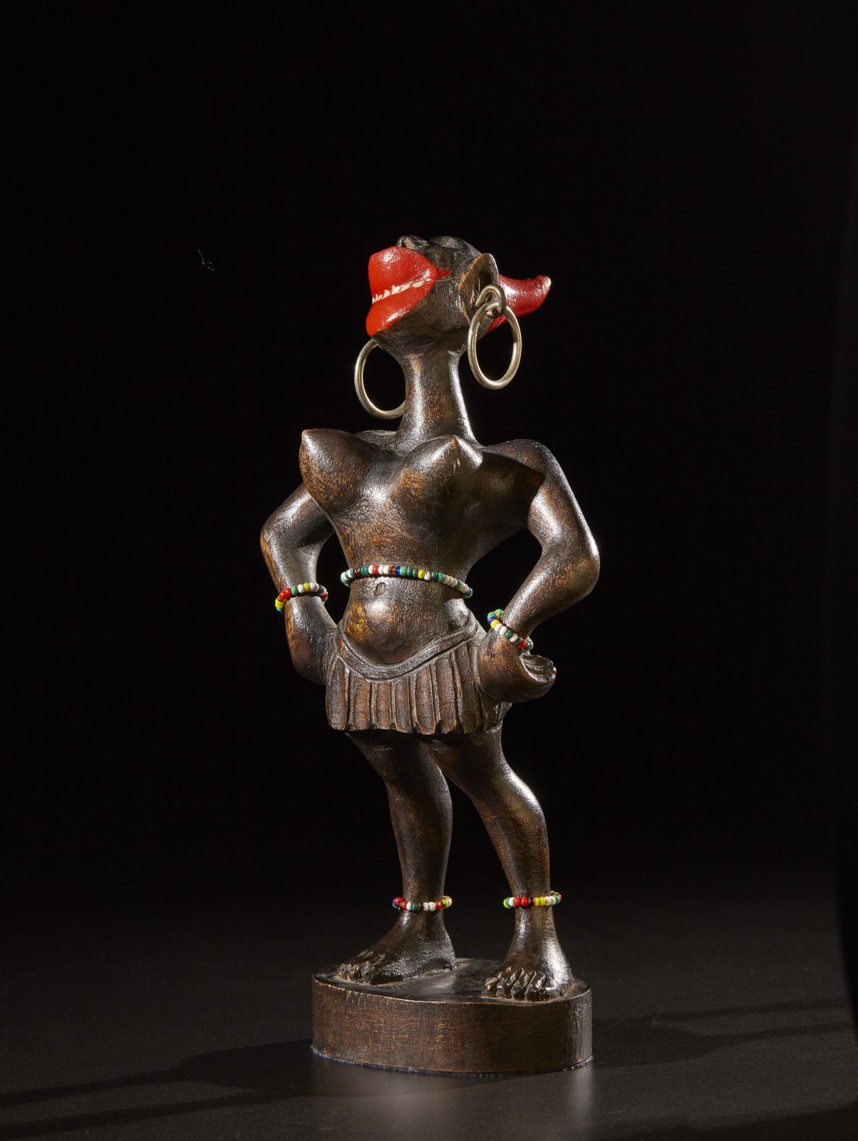 Europa, prima metà del '900. . Cm 11,00 x 22,50 x 6,40. Scultura in legno di figura femminile caricaturale, che lascia trasparire la visione sarcastica e stereotipata, da operetta o cartone animato, in auge in Europa nella prima metà del secolo scorso nei confronti delle donne africane.