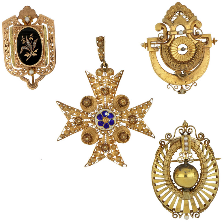 Lotto composto da 4 pezzi in oro coppellato 3 spille e un ciondolo raffigurante croce di Malta in filigrana e smalti blu e bianchi.