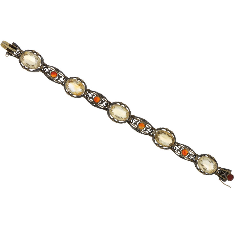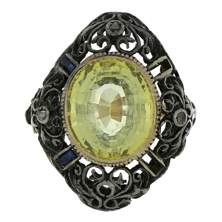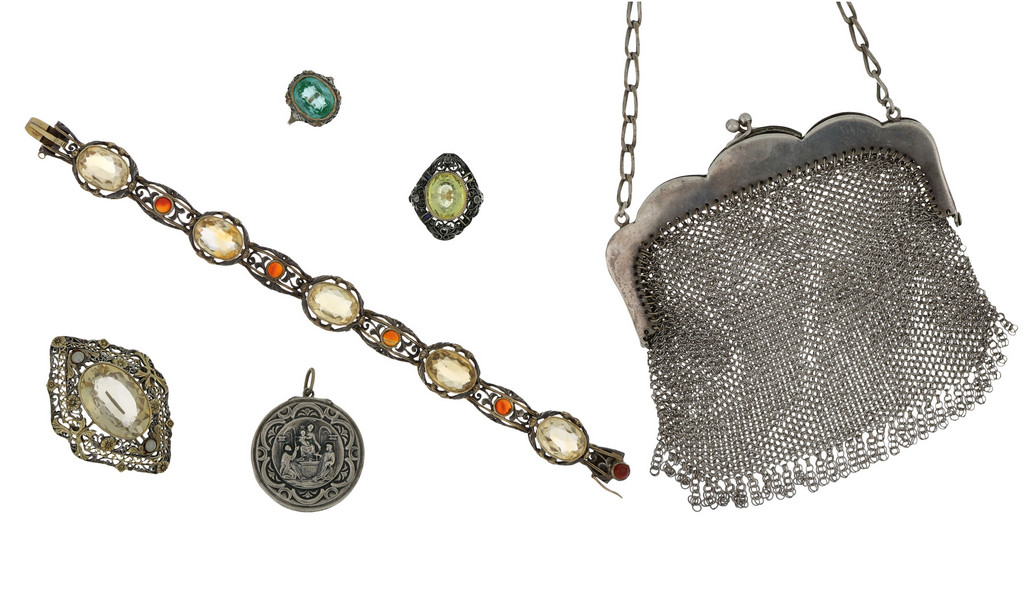 Lotto composto da 6 pezzi in argento argento e oro e pietre alcune di sintesi in particolare due anelli una borsetta un bracciale una spilla e una scatoletta con rosario.