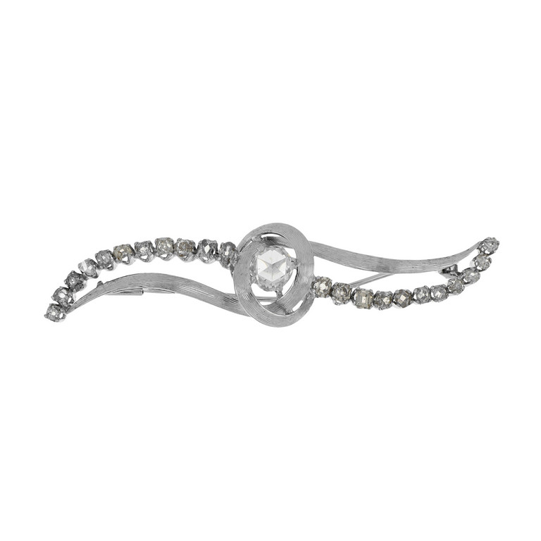 Spilla in oro bianco con lavorazione a millerighe e diamanti il centrale taglio a rosa di circa 0 90 ct