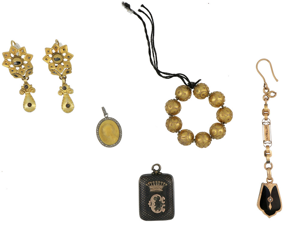 Lotto composto da diversi oggetti in oro giallo bianco e rosso e uno in metallo niellato (portareliqua) di diverso titolo con diamanti taglio rosa e smalti.