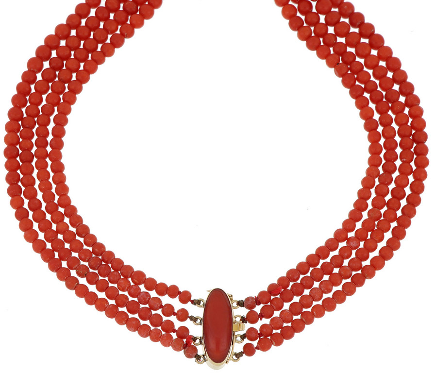 Collana a giro collo a cinque fili scalari di corallo rosso sfere da 3 mm a 9 mm chiusura in oro giallo.