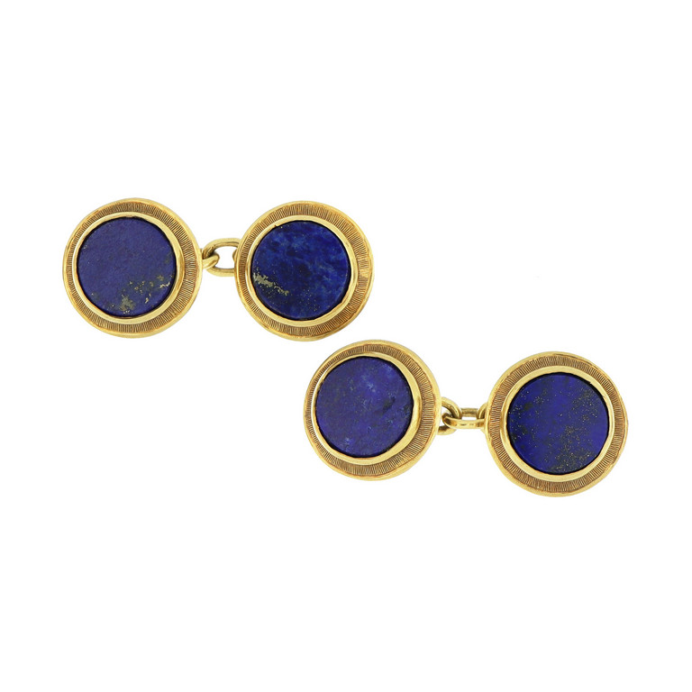 Coppia di gemelli in oro giallo con lapislazuli incastonati su entrambi i lati immagliati a catenella.