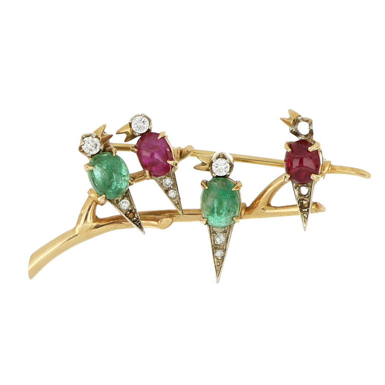 Piccola spilla in oro giallo diamanti e pietre colorate taglio cabochon a raffigurare 4 uccellini su un ramo.