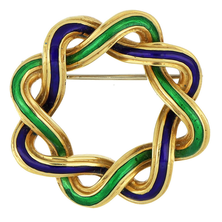 Spilla in oro con smalti verdi e blu a nodo 35mm di diametro.