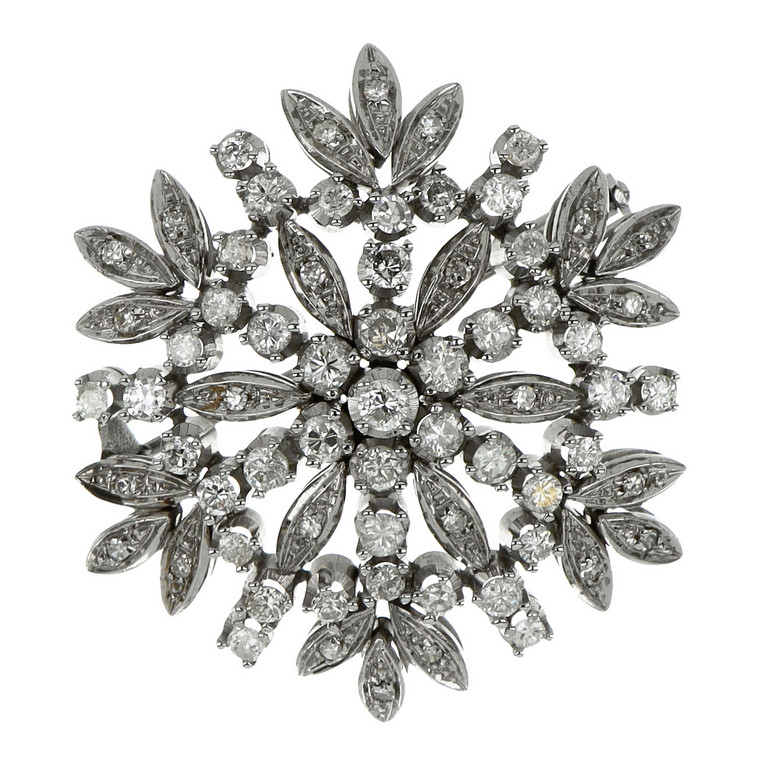 Spilla in oro bianco a forma di fiocco di neve con diamanti taglio brillante incastonati per stimati carati 3 00 ca.