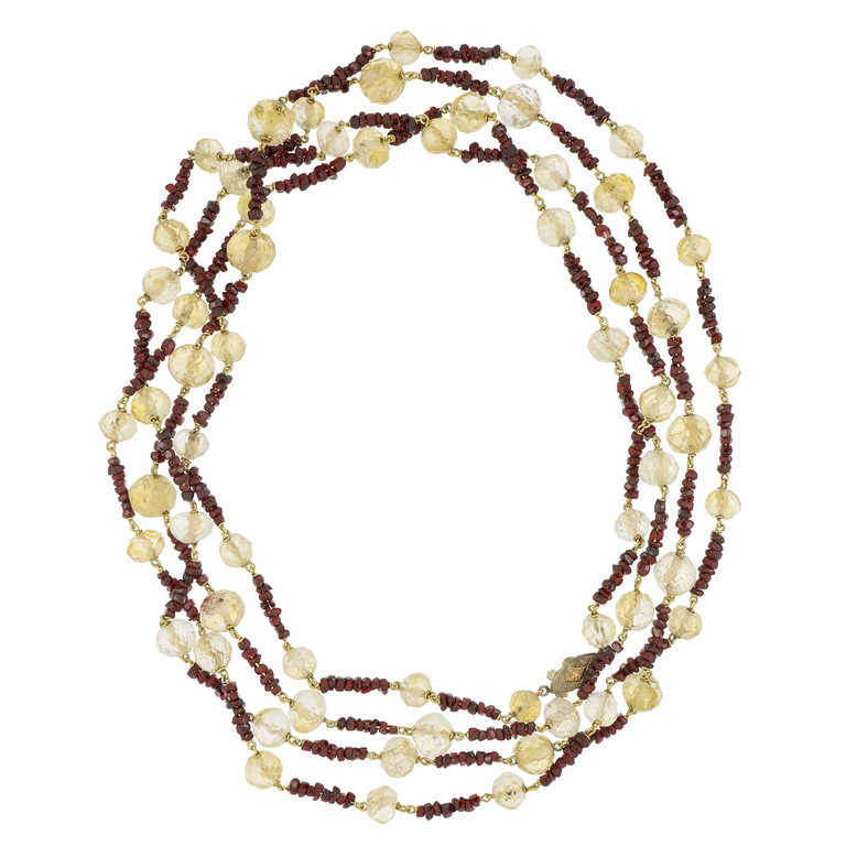 Lunga collana stile Chanel con quarzi e granati intercalati montata in oro giallo con piccola chiusura a rombo incisa.
