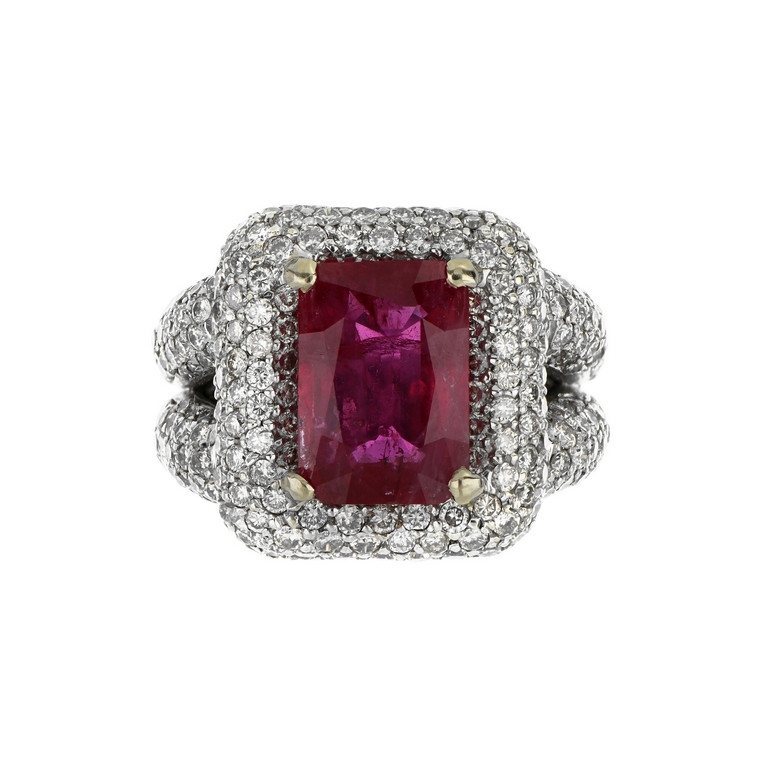 Anello a fascia realizzato in oro bianco con pave' di diamanti taglio brillante su tutta la superficie rubino centrale taglio rettangolare per stimati carati 5 00 ca.