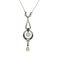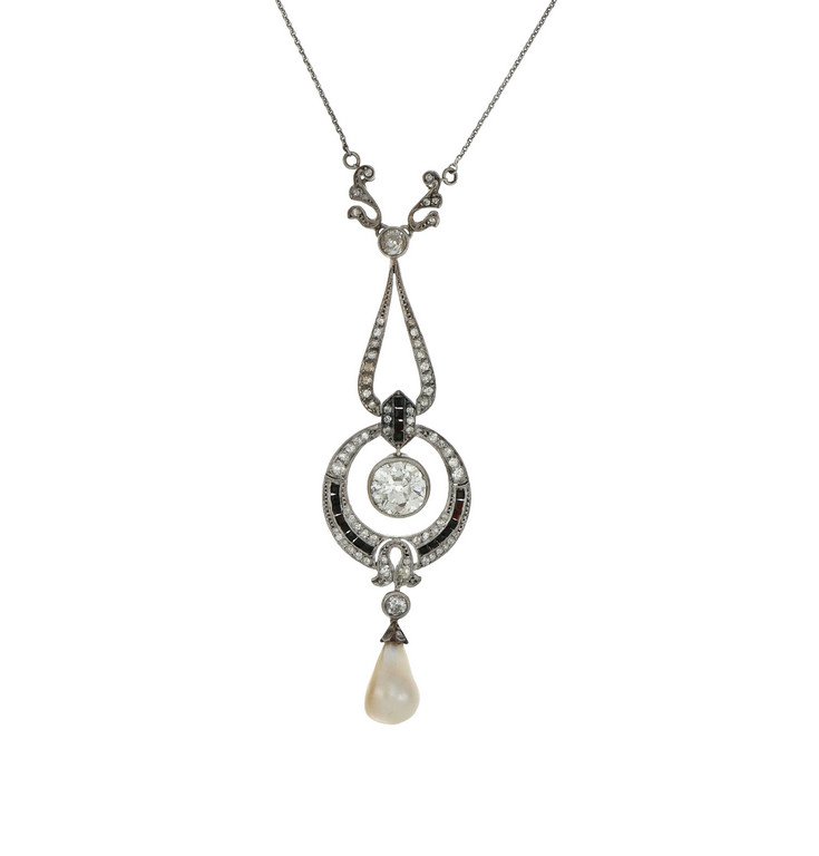Pendente in platino finemente lavorato con perla a goccia probabilmente naturale e diamante taglio vecchia Europa di stimati carati 2 50 ca. impresiosito da piccoli onici e diamanti di vario taglio.