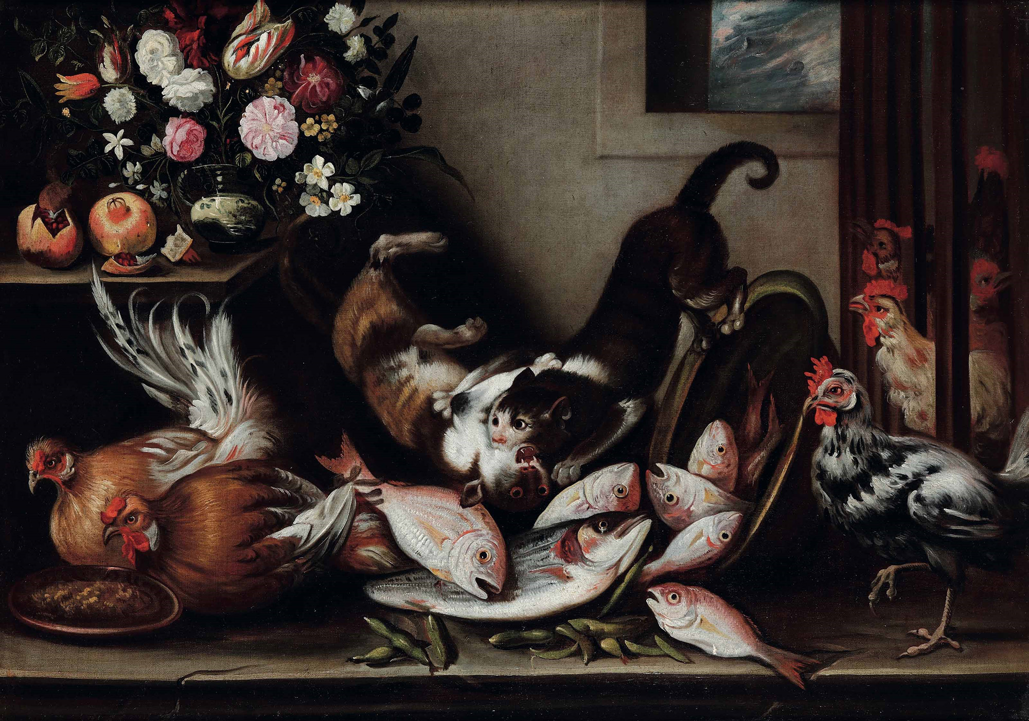 Natura morta con fiori, frutta, galli, pesci e gatti