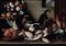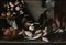 Scuola napoletana del XVIII secolo Natura morta con fiori, frutta, galli, pesci e gatti