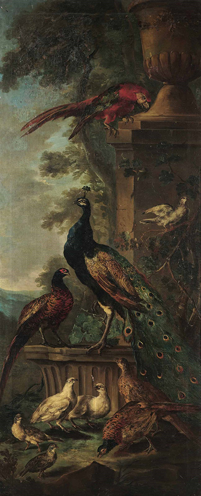 Crivelli Angelo Maria, Veduta di giardino con pavone, pappagallo e altri volatili