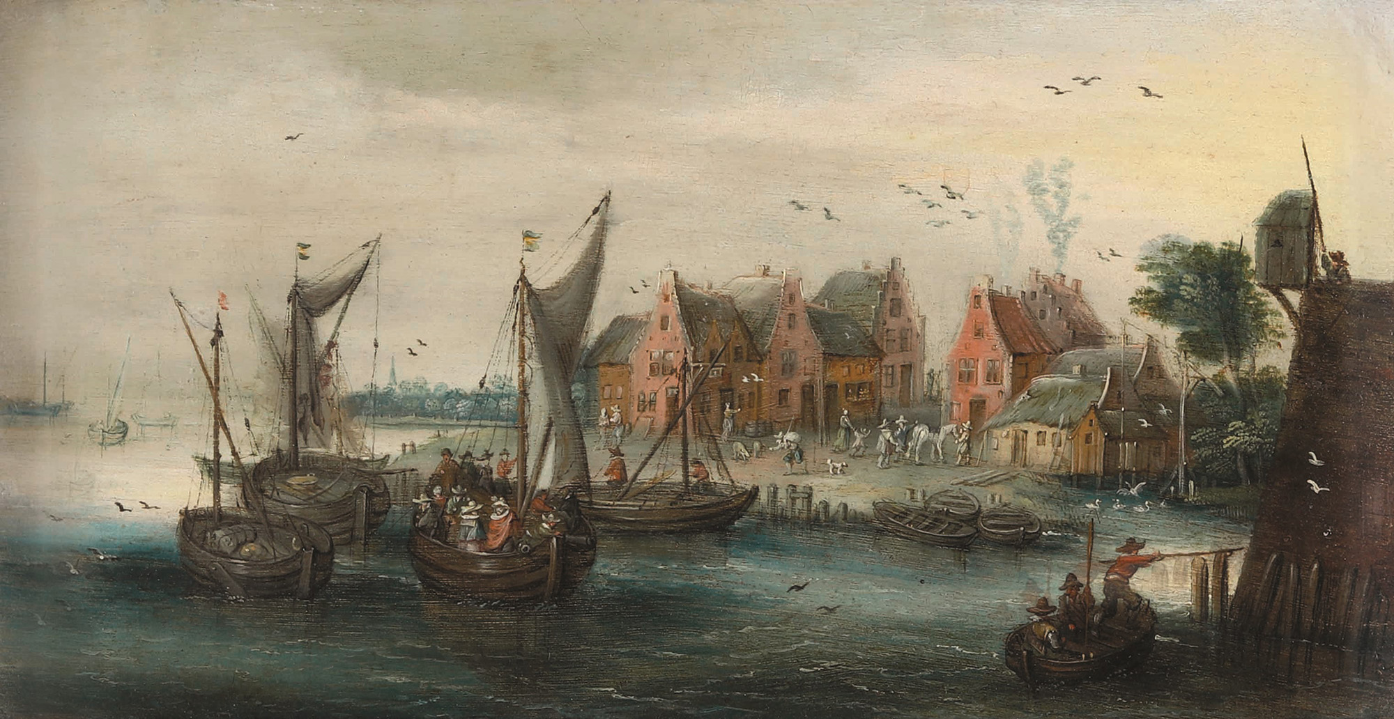 Gijsels Peeter attribuito a, Scorcio con approdo e villaggio