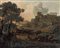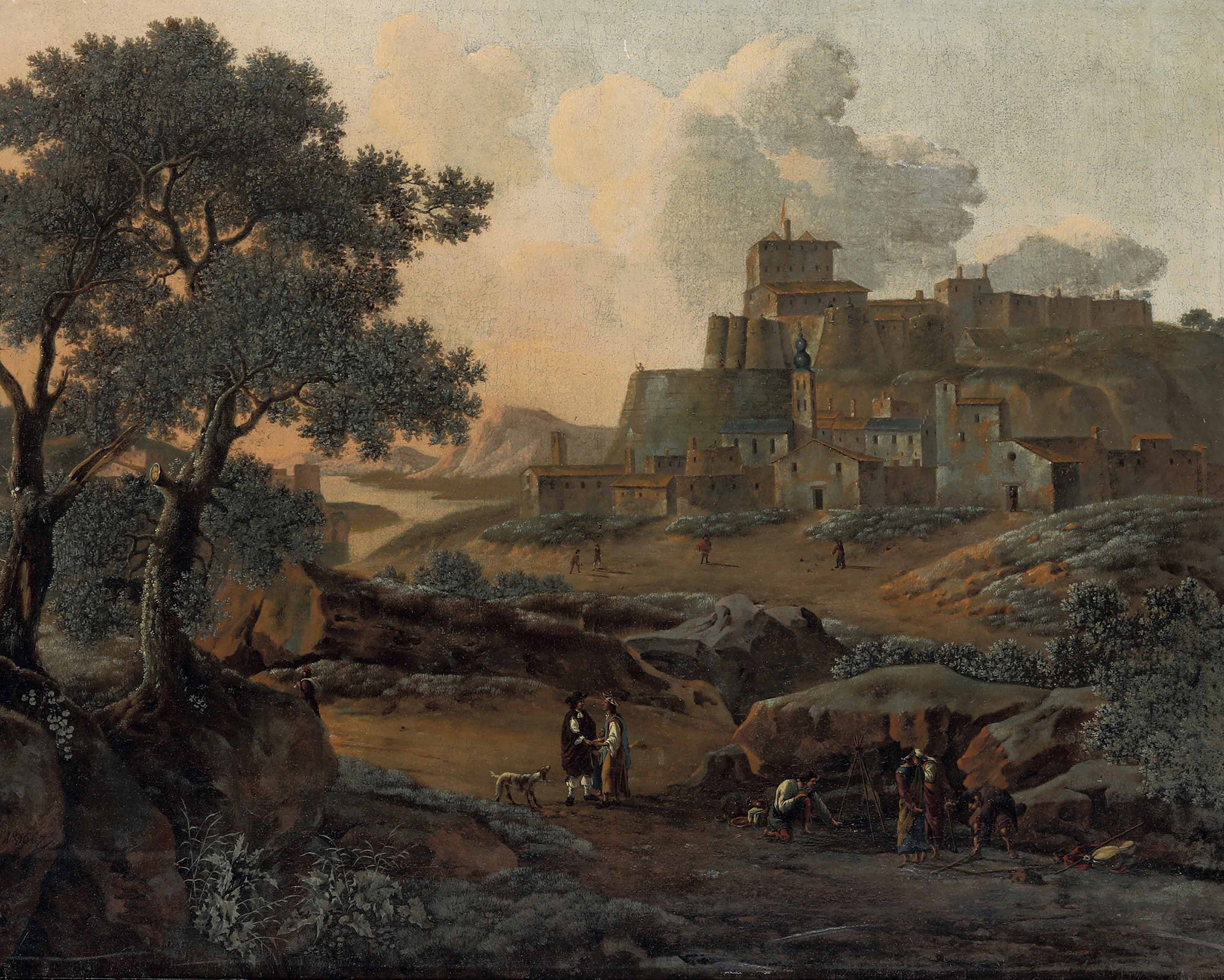 Scuola romana del XVII secolo Paesaggio con contadini e cittadella sullo sfondo