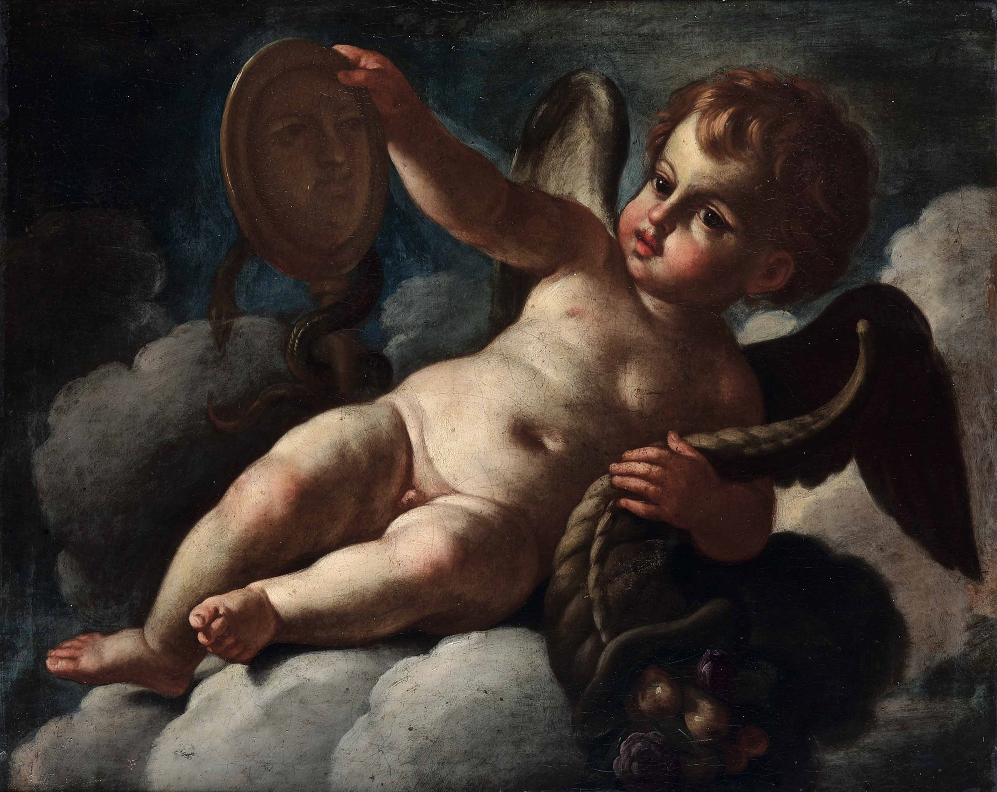 Lotto 476 | Scuola emiliana del XVII secolo Allegoria con putto con gli attributi della Prudenza e dell'Abbondanza