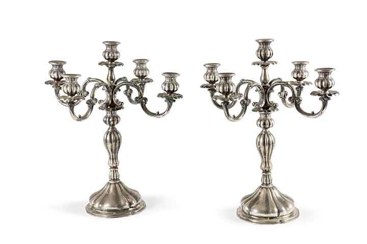 Coppia di candelieri in argento, a cinque luci, punzoni "del Fascio"