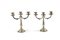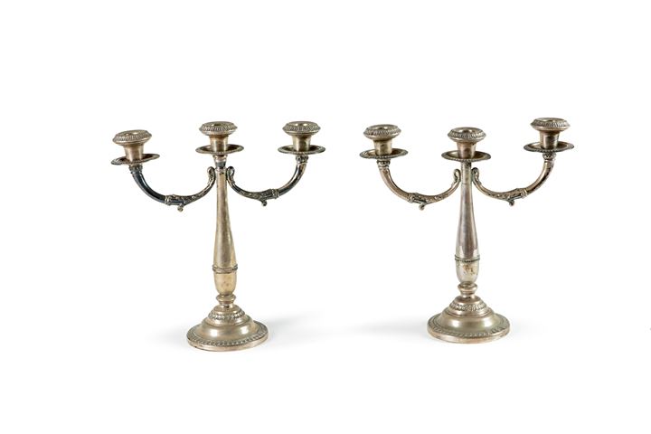 Coppia di candelieri in argento, a tre luci, di gusto neoclassico