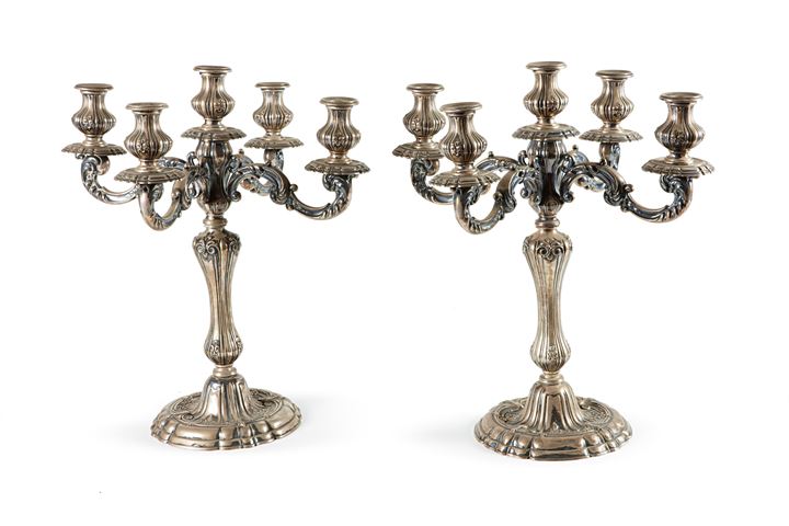 Coppia di candelieri in argento, a cinque luci, inizio XX secolo, di gusto barocco