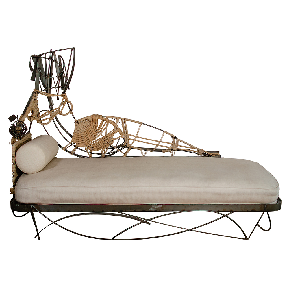 CHAISE - LONGUE IN METALLO PATINATO E CORDE Chaise - longue in metallo patinato e corde con elemento antropomorfo che evoca nelle forme la Paolina Bonaparte di Canova, 1950 circa, cm 132x190x93. Pezzo unico.