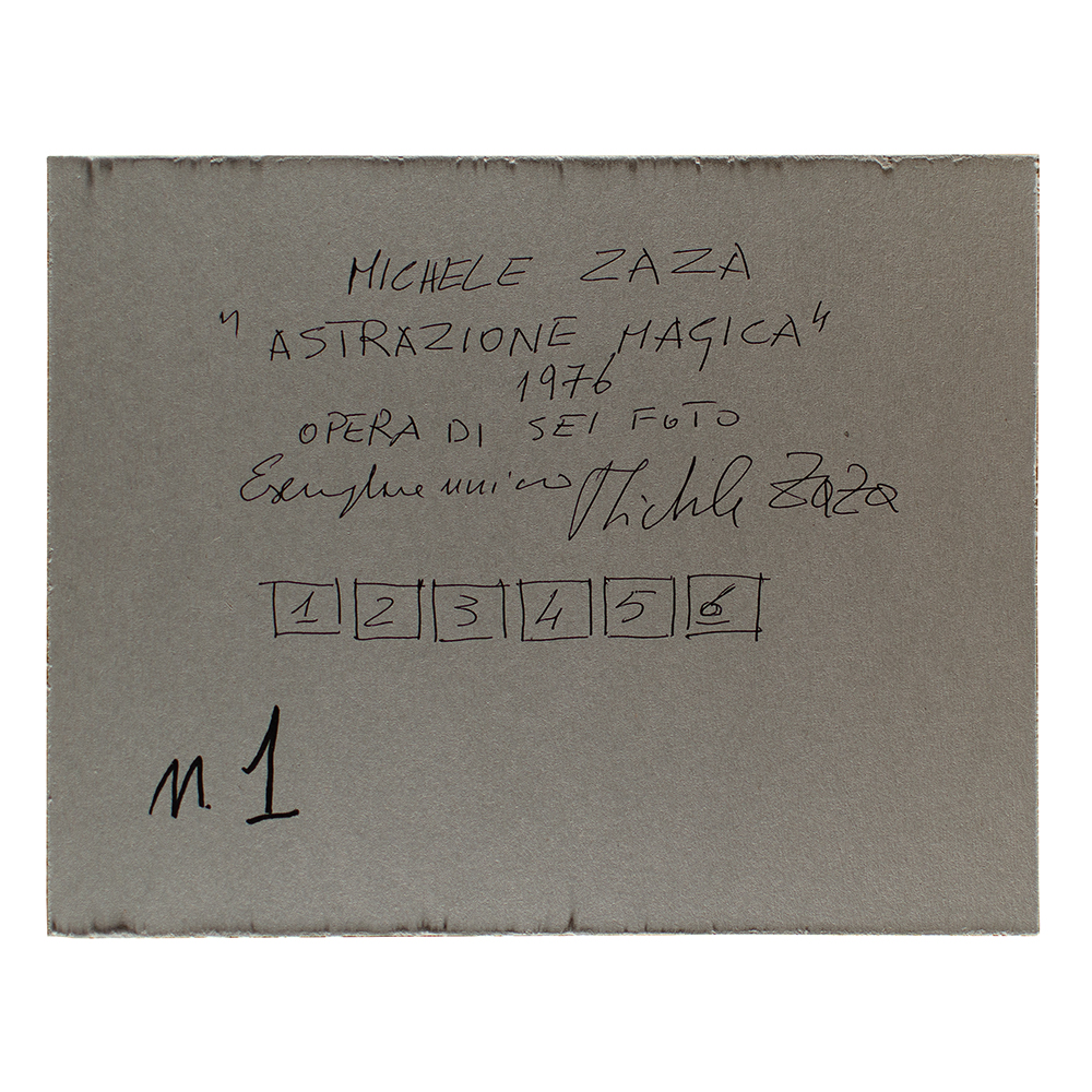 La prima foto è firmata, datata e titolata al verso: Michele Zaza “Astrazione magica” 1976 opera di sei foto. Esemplare unico.