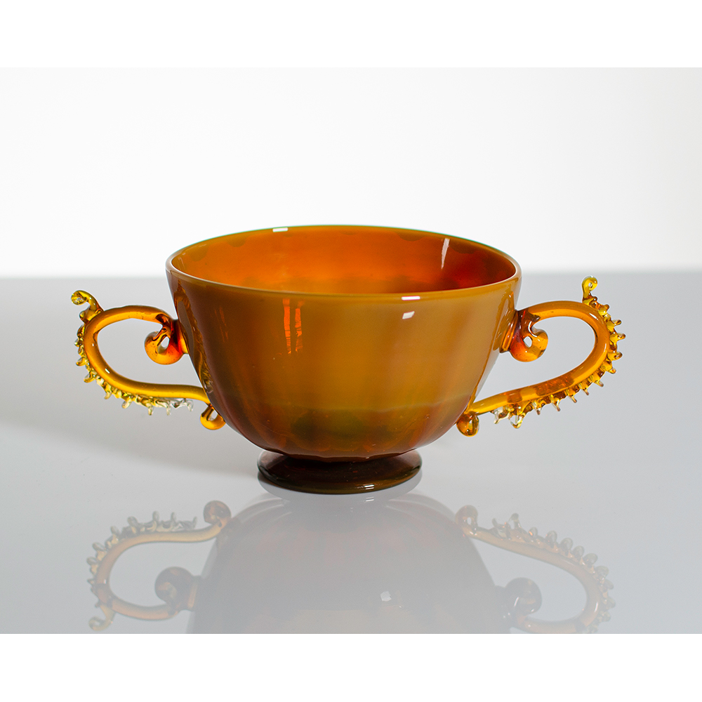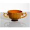 Coppa in vetro opalino ambra con piede e anse applicate in vetro trasparente miele, anni ‘30.