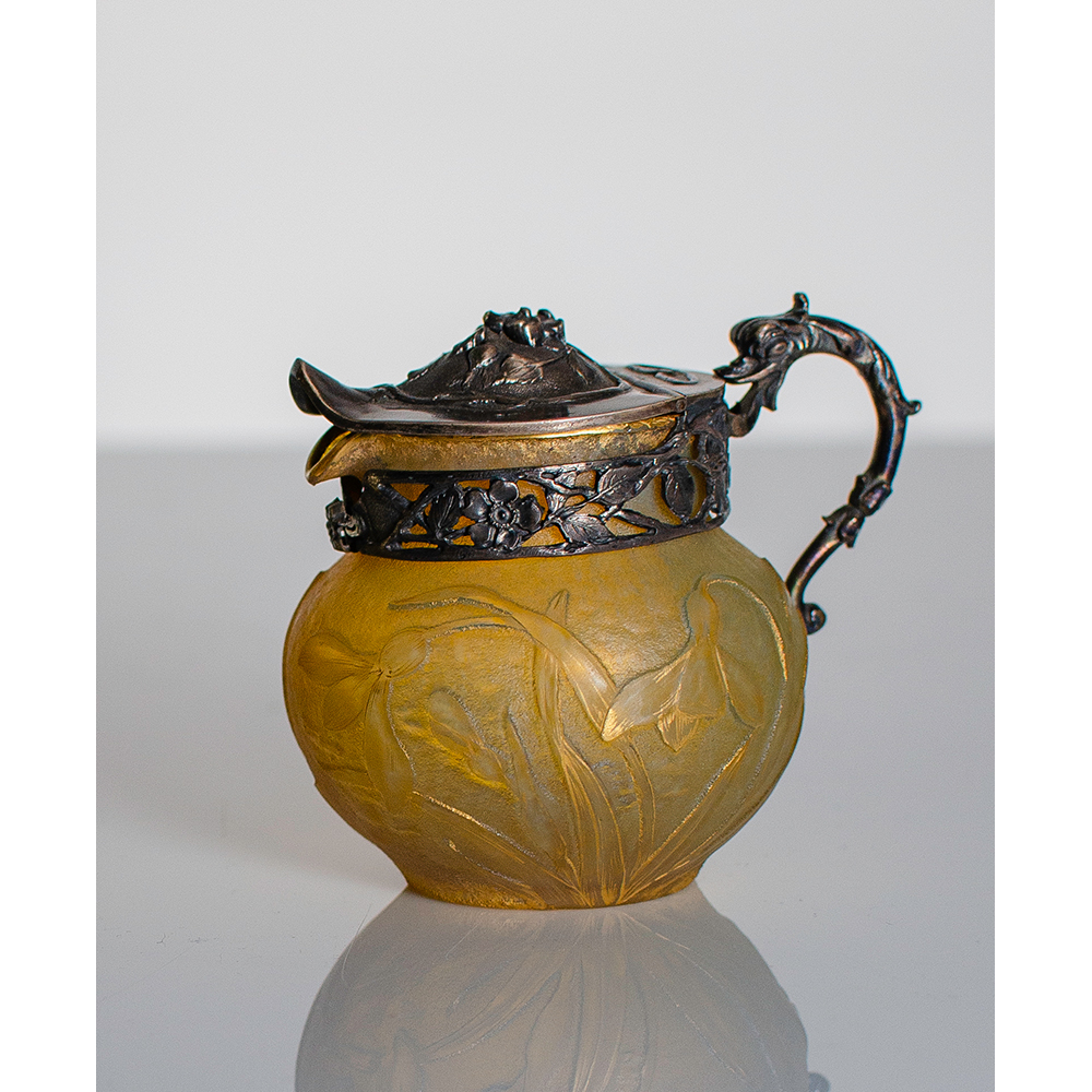 Piccola lattiera in vetro giallo con decoro a rilievo dorato e presa in argento leggermente dorato, 1900 circa, altezza cm 7,2.