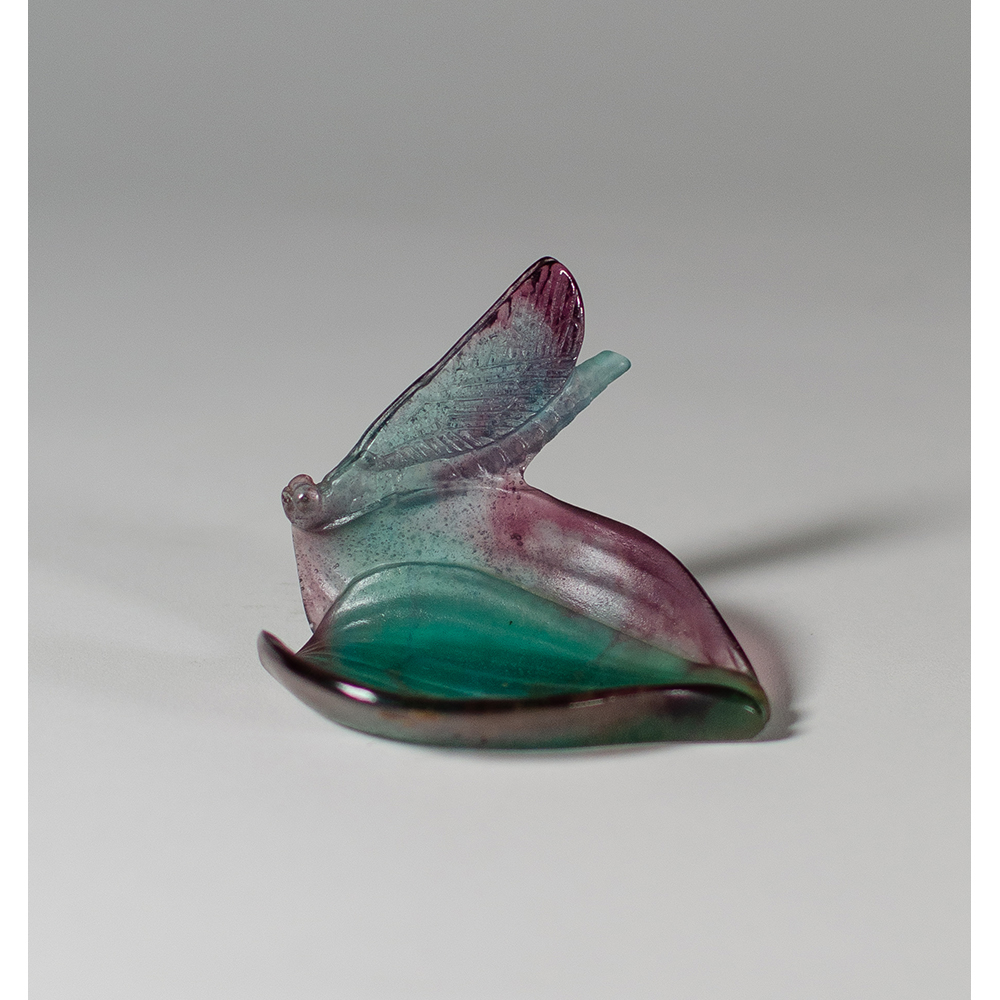 Piccolo piattino in pasta di vetro nei toni del verde e del viola con decorazione a guisa di libellula, lunghezza cm 9.