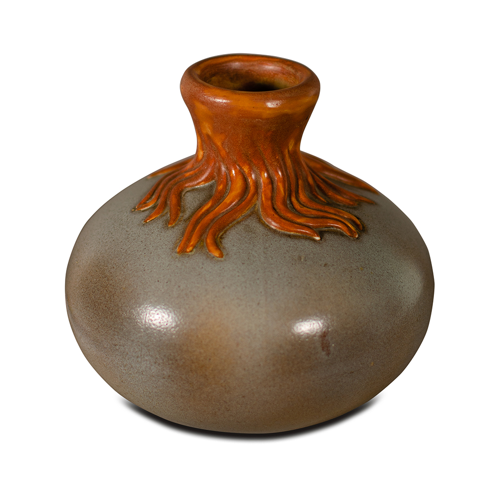 Vaso modello “6736” in terraglia modellata e smaltata con collo decorato a fili, anni ‘30, altezza cm 16,5. Marchio alla base in verde: