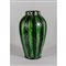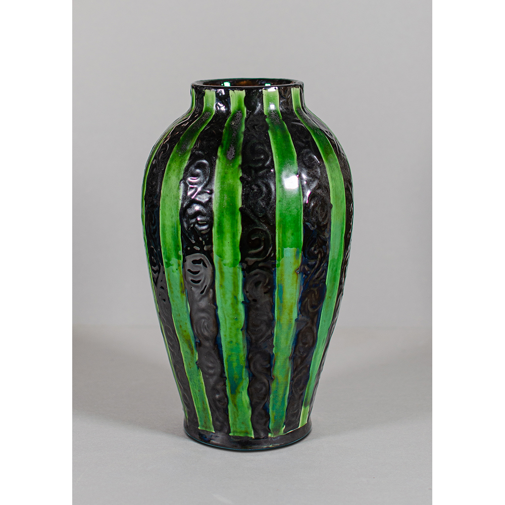 Vaso in ceramica maiolicata dipinta a smalti nei toni del verde con decoro a rilievo, databile, per le caratteristiche del marchio impresso alla base, attorno al 1910 circa, altezza cm 29,5.