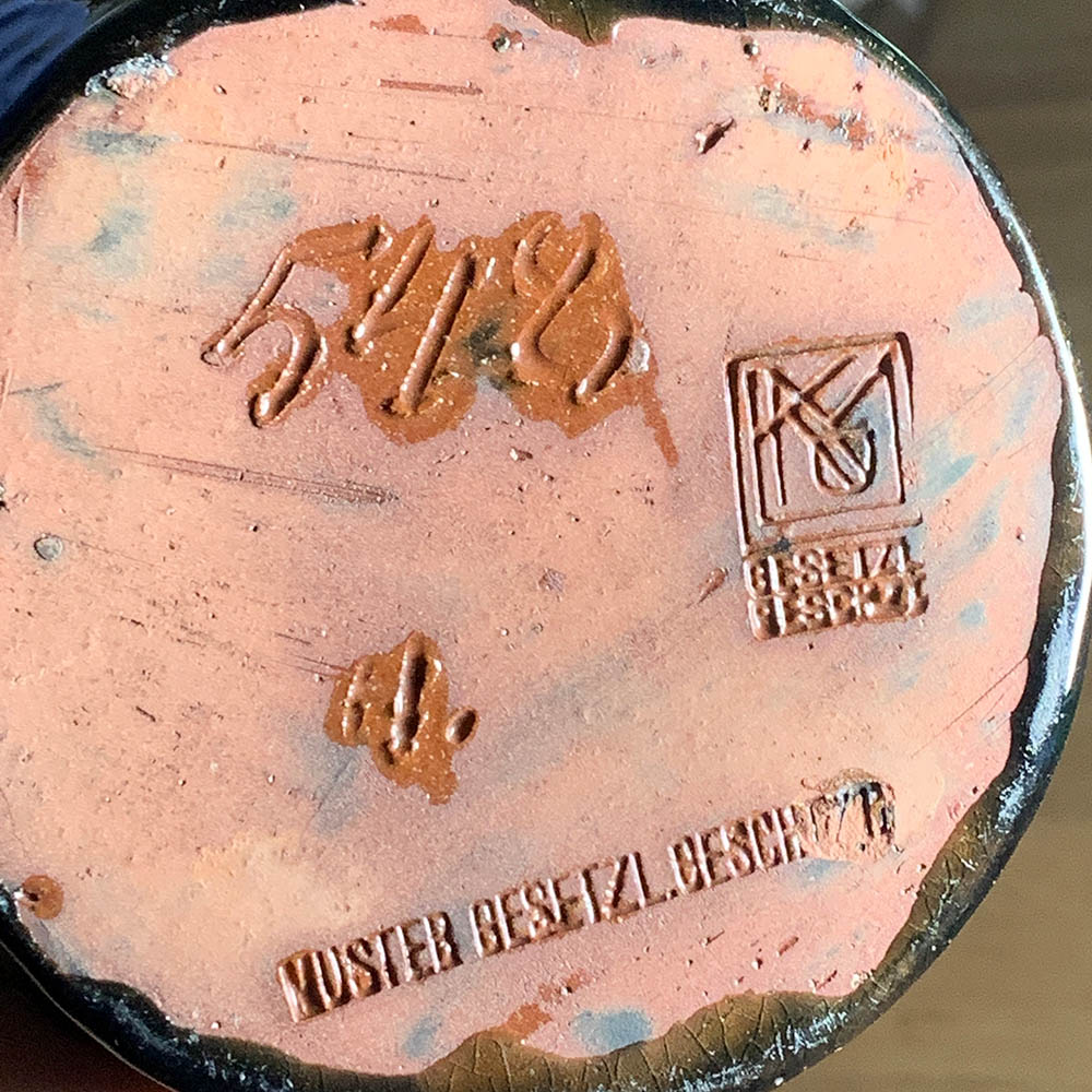 Restauri. Sotto la base marchio del ceramista: Karlsruhe Max Läuger con stemma del Gran Ducato di Baden. Sotto la base dicitura: 548 Muster Gesetzl Geschtzt
