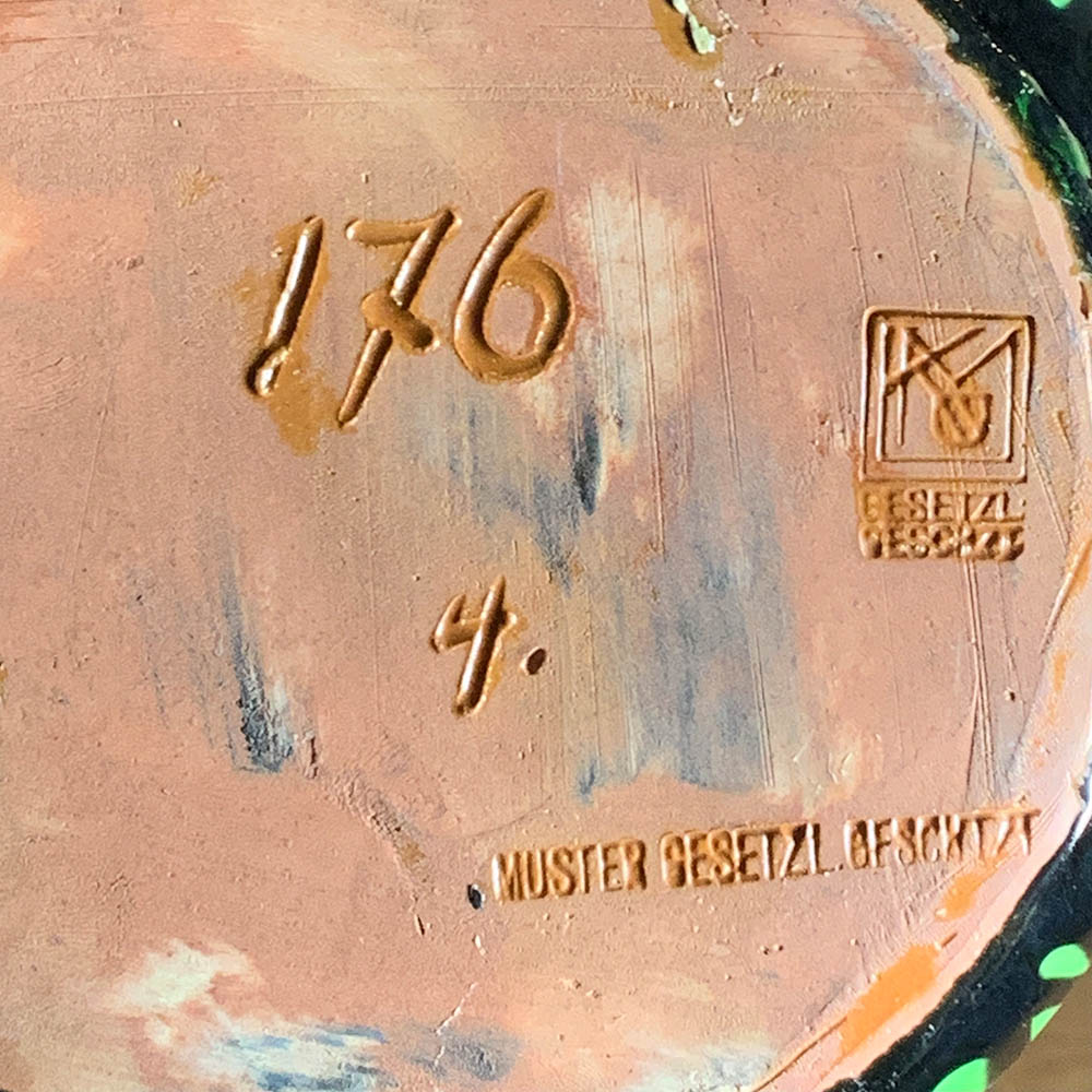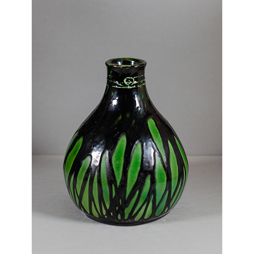 Vaso in ceramica maiolicata dipinta a smalti nei toni del verde, databile, per le caratteristiche del marchio impresso alla base, attorno al 1910 circa, altezza cm 23. Restauri. Sotto la base marchio del ceramista: Karlsruhe Max Läuger con stemma del Gran Ducato di Baden. Sotto la base dicitura: 176 Muster Gesetzl Geschtzt
