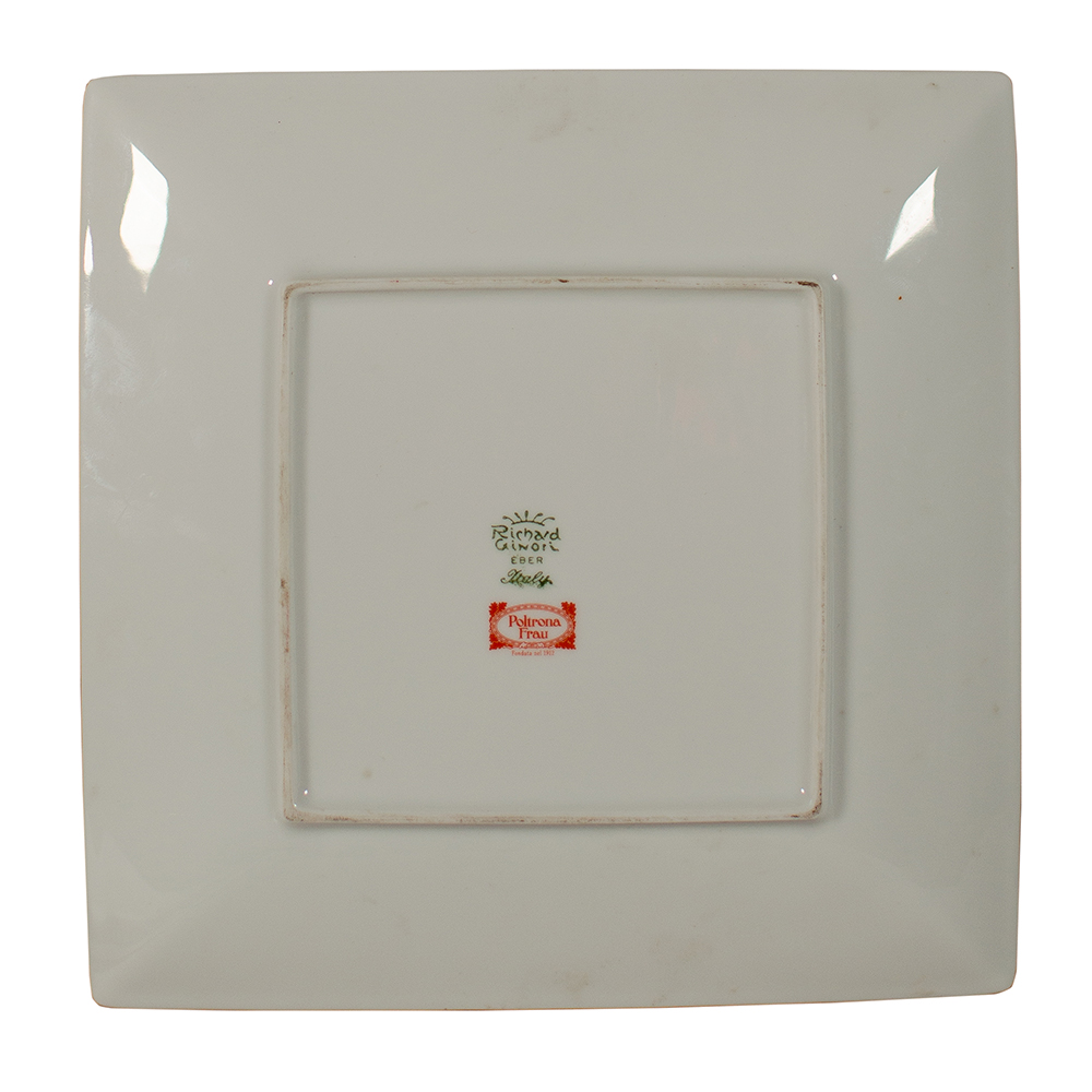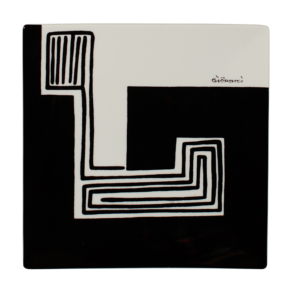 Piatto in ceramica ispirato alla fantasia del tessuto della seduta della poltrona Dezza di Gio Ponti, dimensioni cm 22x22. Marchio alla base: Richard Ginori Eber Poltrona frau