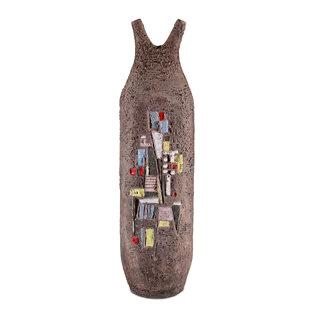 Vaso in ceramica smaltata con decoro geometrico in policromia, anni ‘50, altezza cm 51.