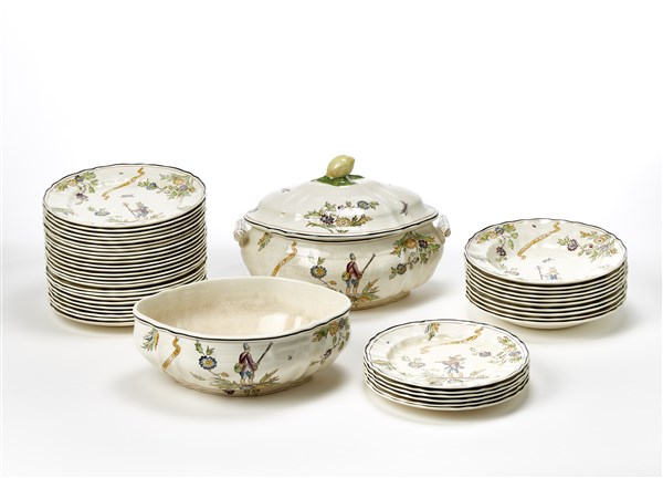 Parte di servizio da tavola della serie "Ermione". Manifattura Richard - Ginori S.Cristoforo, Milano, anni '30. Composto da dieci piatti fondi, sei piattini, venticinque piatti piani, una zuppiera con coperchio e una insalatiera. Marcato sotto la base e recante numerali. (lievi difetti)