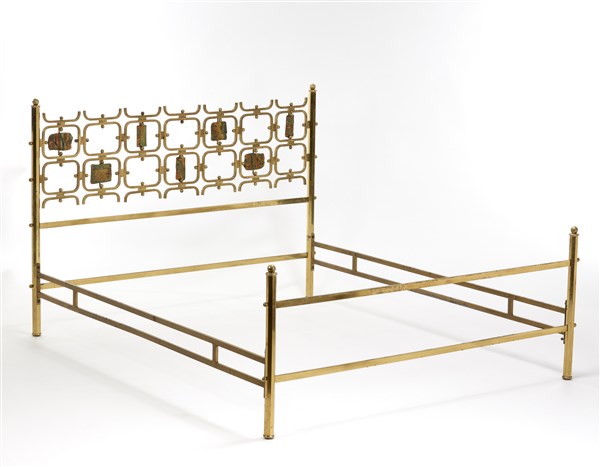 Double bed. Produced by Arredamenti Borsani, Varedo, 1958/1962. Brass-plated steel, beaten brass with enameled tiles in shades of green, blue, red and orange. (177x120.5x205 cm.) (slight defects)