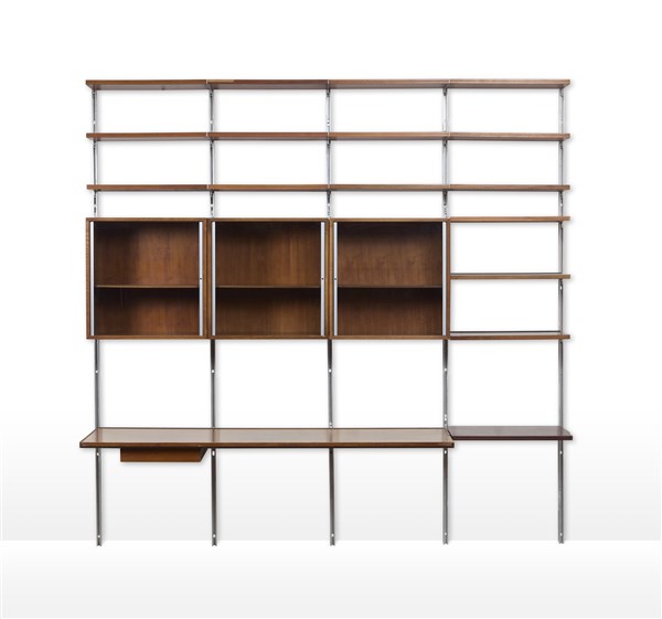 Four-span bookcase with open shelves and three showcase cabinets of the series "E22". Produced by Tecno, Varedo, 1970s. Metal and solid and veneer wood. Production label. (283x281x59 cm.) (defects and losses)