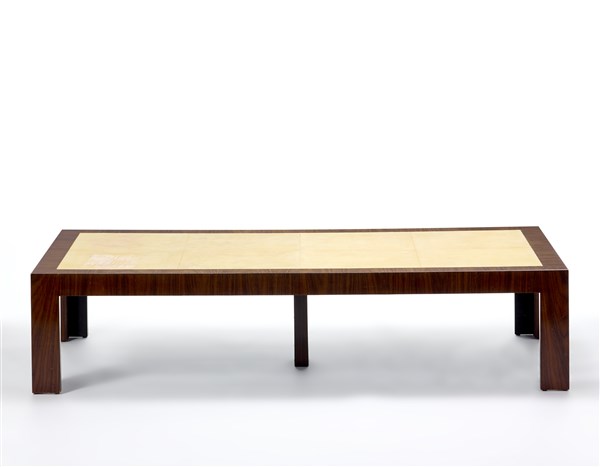 Déco style living room table with veneered wood structure, top covered in parchment. Italy, 20th century. (190x43.5x90 cm.) (defects and restorations)