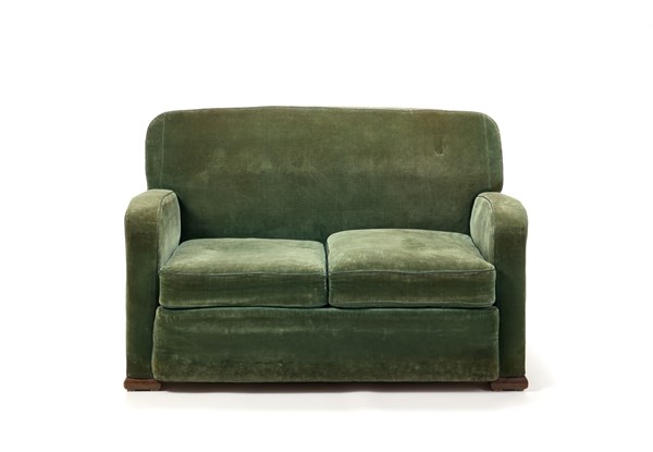 Divano Novecento a due posti con struttura in legno e rivestimento in velluto verde. Italia, anni '30. (cm 135x79x85) (difetti)