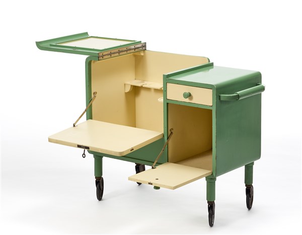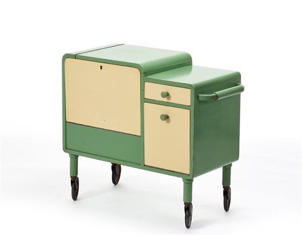 Carrellino bar razionalista in legno verniciato bianco e verde con stipo, cassettino e ribalta. Italia, anni '30. (cm 80x70,5x36,5) (difetti)