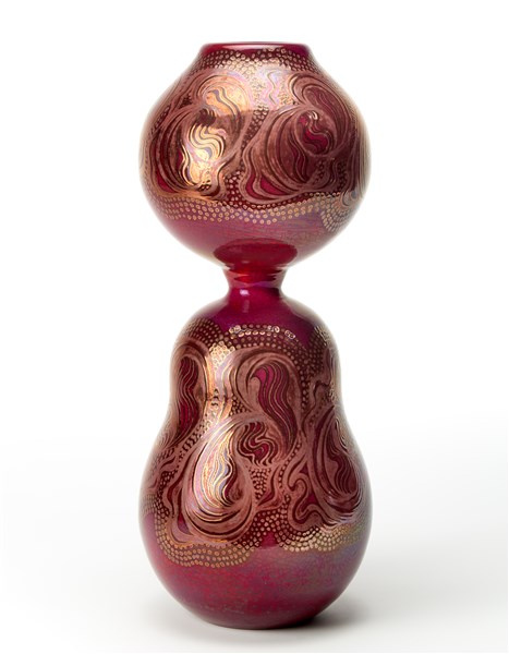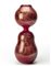Vase with double bulb in glazed ceramic with metallic luster in shades of red-purple colour with informal decorations. Faenza, 2000s. Signed under the base "SASSI FAENZA". (h 64 cm.) (slight defects)