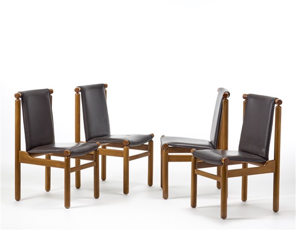 Lotto di quattro sedie. Italia, anni '70. Struttura in legno, seduta e schienale in pelle marrone. (cm 48x92x56) (difetti)