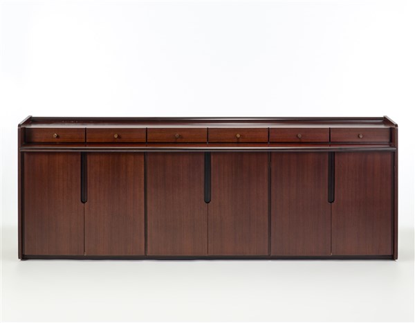 Credenza a sei cassetti e sei ante in legno massello e impiallacciato con manig