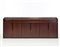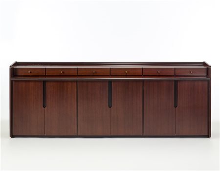Credenza a sei cassetti e sei ante in legno massello e impiallacciato con maniglie in ottone. Italia, anni '70. (cm 243x89x48) (lievi difetti)