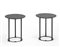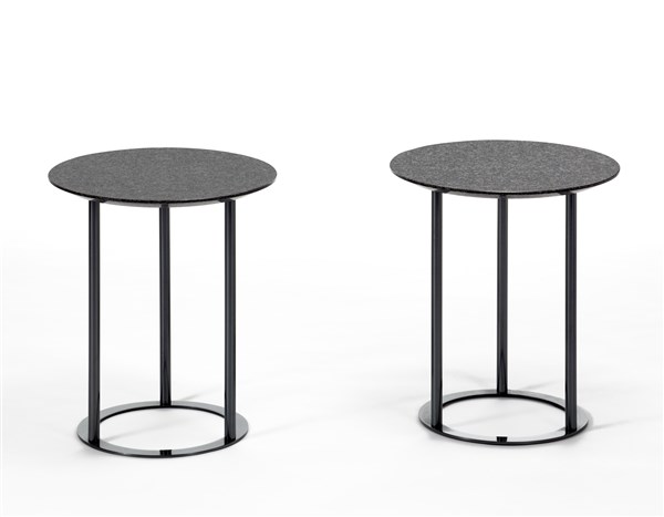 Coppia di tavolini tondi. Produzione Arflex, Italia, 1981. Struttura in acciaio verniciato nero, piano in granito. (h cm 45,5; d cm 40)