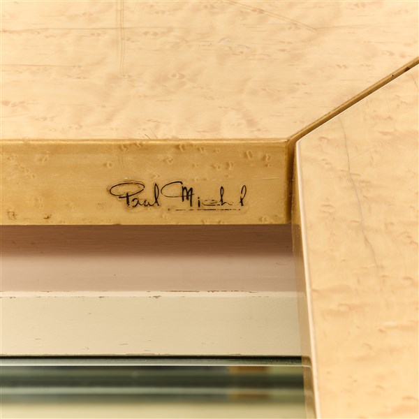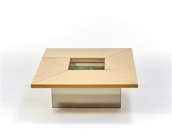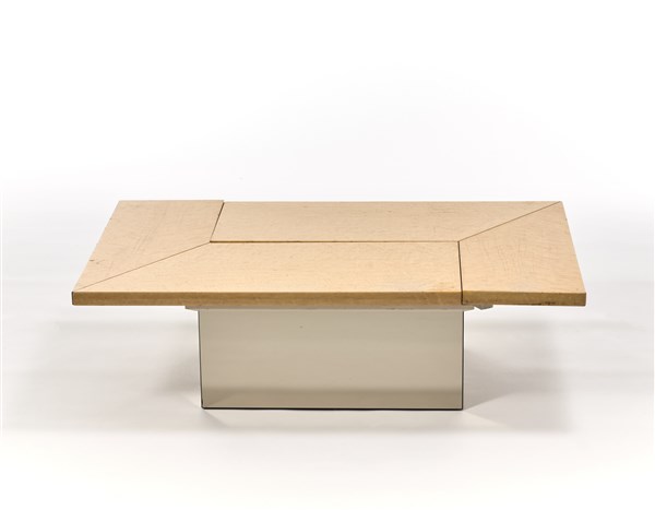 Tavolo da salotto-bar con piano apribile. Francia, anni '70. Legno impiallacciato in radica, base specchiata. Firmato sulla battuta interna di chiusura del piano. (chiuso cm 120x37,5x95) (difetti)