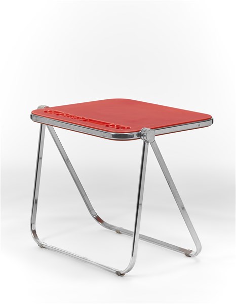 Tavolo pieghevole modello "Platone". Produzione Anonima Castelli, Bologna, anni '70. Metallo cromato, acciaio e plastica rosso. (cm 82x70x64) (lievi difetti)