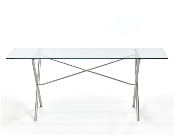 Tavolo modello "Quadrante". Produzione Xilitalia, Italia, anni '80. Struttura in metallo satinato, piano in cristallo. (cm 180x72x75) (lievi difetti)