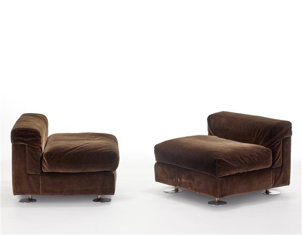 Due poltrone-pouf. Produzione Tecno, Milano, anni '70. Rivestimento in velluto marrone. (cm 73x50x73) (difetti)