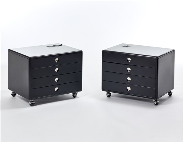 Coppia di comodini modello "CA151". Produzione Tecno, Varedo, 1971. Legno laccato nero e alluminio. Recanti etichette adesive del produttore all'interno del cassetto. (cm 65x52x50) (difetti)